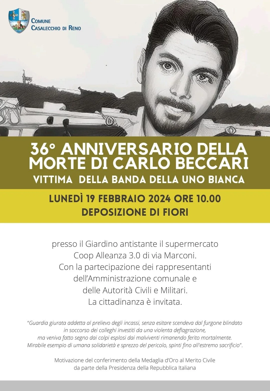 Sabato 10 febbraio, in occasione del Giorno del Ricordo, alle ore 10.30 davanti al cippo commemorativo vicino alla rotatoria Piave/Ugo Bassi (lato cimitero), si è svolta la cerimonia di commemorazione delle vittime delle foibe, dell'esodo giuliano-dalmata e delle vicende del confine orientale, alla presenza delle istituzioni civili e militari.Sono intervenuti il sindaco Massimo Bosso e Giovanni Stipcevich, vice presidente ANVGD Comitato Provinciale di Bologna.
