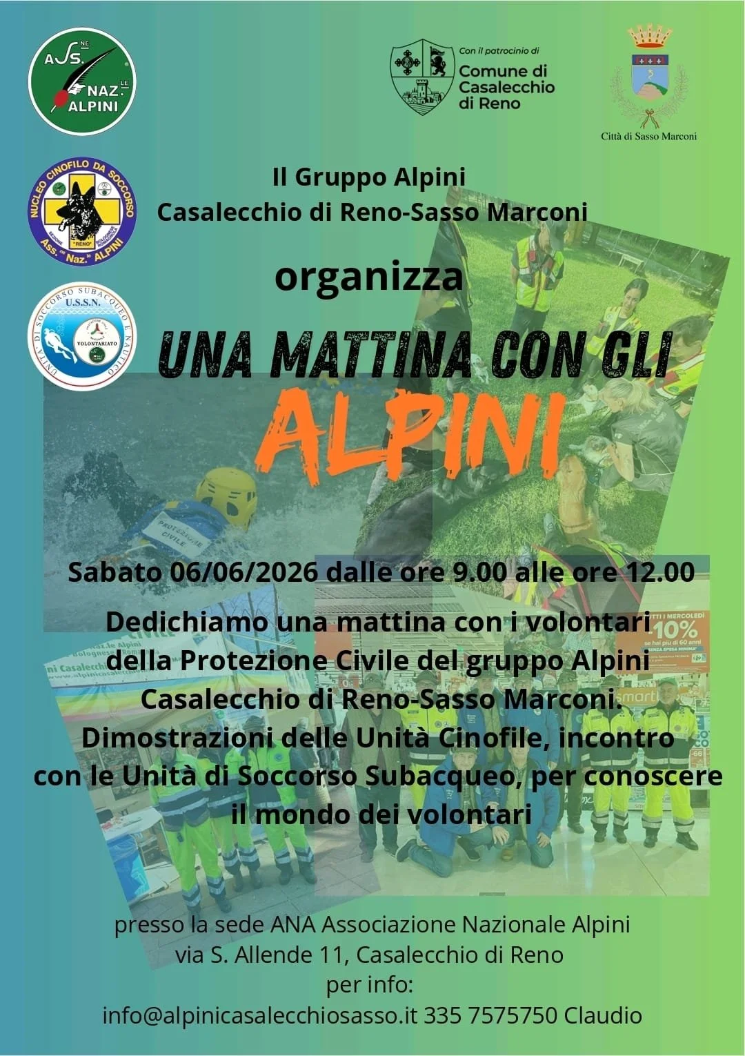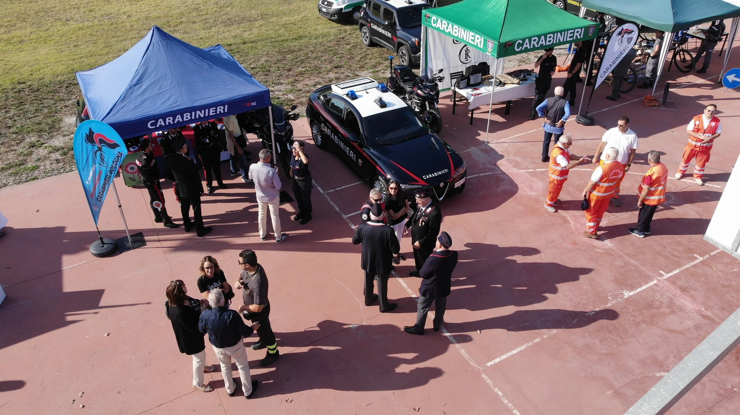 Con i primi raggi del sole di una mattina che si prospetta splendida e luminosa, presso l’area destinata alla festa iniziano a prendere posto gli “Angeli”, Polizia Locale, Polizia di Stato, Polizia Stradale, Vigili del Fuoco, Esercito, Carabinieri, Guardia di Finanza, Croce Rossa Italiana, il volontariato locale, capeggiato da Gruppo Alpini Casalecchio di Reno e Sasso Marconi, con i suo componenti di p.c. ed il nucleo specializzato di Subacquea e le compagini della Pubblica Assistenza di Casalecchio, le forze di P.C. di Valsamoggia, le Guardie Ecologiche Volontarie, i Radioamatori.